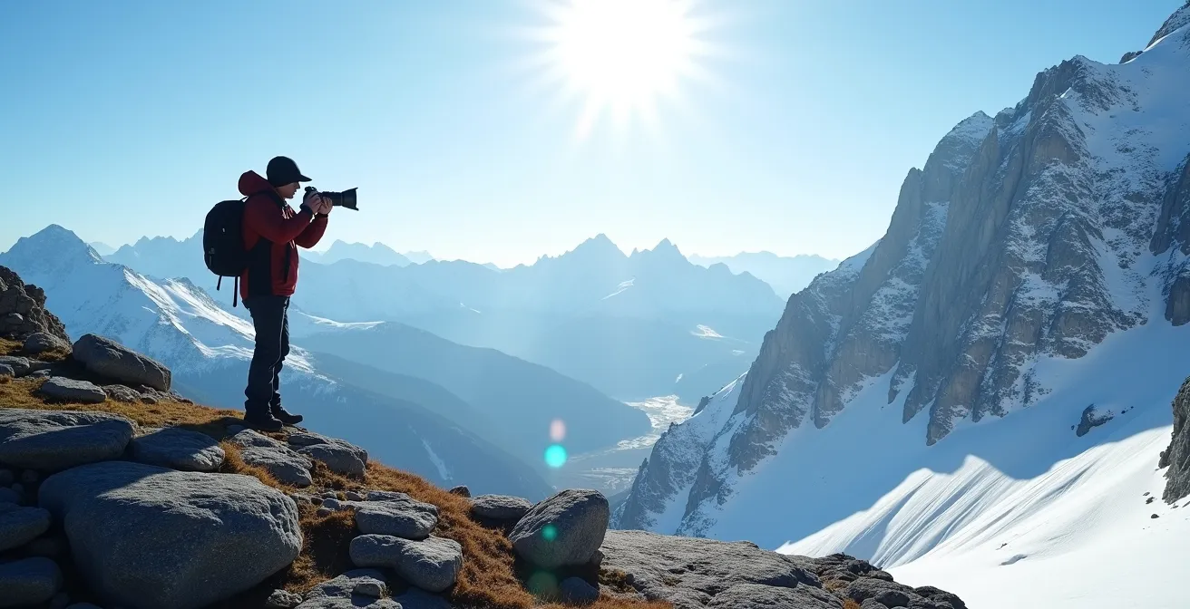 Vous rentrez d’une randonnée en montagne, ébloui par la majesté des sommets sous le soleil de midi. Pourtant, une fois devant votre écran, la déception est immense : le ciel est blanc laiteux, les ombres sont des trous noirs sans détail, et la photo est désespérément plate. Elle ne transmet rien de la puissance que vous avez ressentie. Cette frustration, tous les photographes amateurs la connaissent. Le conseil habituel est simple : évitez de photographier entre 11h et 16h. Mais en montagne, c’est souvent le seul moment où l’on atteint les plus beaux points de vue.
